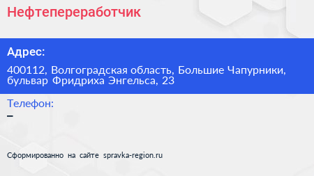 Нефтепереработчик по адресу 400112, Волгоградская область, Большие Чапурники, бульвар Фридриха Энгельса, 23 в дальнейшем Организация, размещена в следующих категориях:
