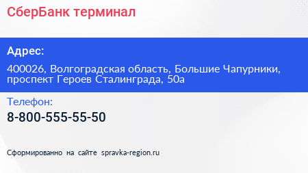 СберБанк, терминал по адресу 400026, Волгоградская область, Большие Чапурники, проспект Героев Сталинграда, 50а в дальнейшем Организация, размещена в следующих категориях: