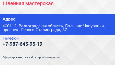 Швейная мастерская по адресу 400112, Волгоградская область, Большие Чапурники, проспект Героев Сталинграда, 37 в дальнейшем Организация, размещена в следующих категориях: