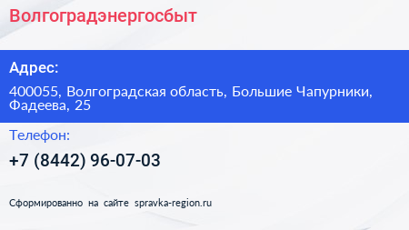 Волгоградэнергосбыт по адресу 400055, Волгоградская область, Большие Чапурники, Фадеева, 25 в дальнейшем Организация, размещена в следующих категориях: