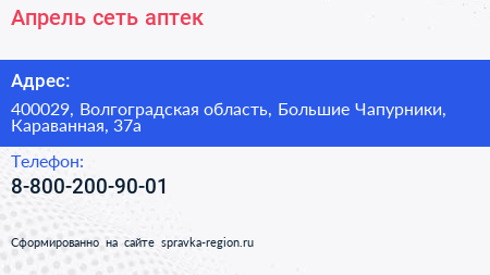 Апрель, сеть аптек по адресу 400029, Волгоградская область, Большие Чапурники, Караванная, 37а в дальнейшем Организация, размещена в следующих категориях: