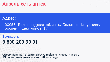 Апрель, сеть аптек по адресу 400055, Волгоградская область, Большие Чапурники, проспект Канатчиков, 19 в дальнейшем Организация, размещена в следующих категориях: