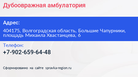Дубоовражная амбулатория по адресу 404175, Волгоградская область, Большие Чапурники, площадь Михаила Хвастанцева, 6 в дальнейшем Организация, размещена в следующих категориях:
