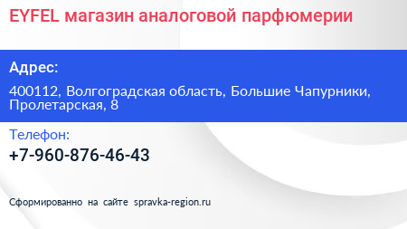 EYFEL, магазин аналоговой парфюмерии по адресу 400112, Волгоградская область, Большие Чапурники, Пролетарская, 8 в дальнейшем Организация, размещена в следующих категориях: