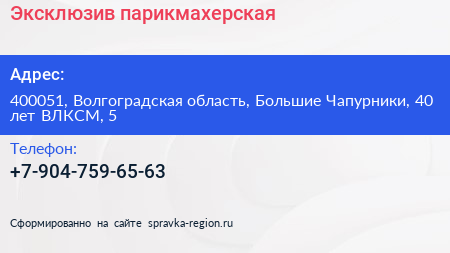 Эксклюзив, парикмахерская по адресу 400051, Волгоградская область, Большие Чапурники, 40 лет ВЛКСМ, 5 в дальнейшем Организация, размещена в следующих категориях: