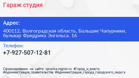 Гараж, студия по адресу 400112, Волгоградская область, Большие Чапурники, бульвар Фридриха Энгельса, 16 в дальнейшем Организация, размещена в следующих категориях: