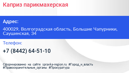 Каприз, парикмахерская по адресу 400029, Волгоградская область, Большие Чапурники, Саушинская, 34 в дальнейшем Организация, размещена в следующих категориях: