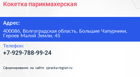 Кокетка, парикмахерская по адресу 400086, Волгоградская область, Большие Чапурники, Героев Малой Земли, 45 в дальнейшем Организация, размещена в следующих категориях: