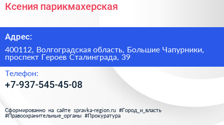 Ксения, парикмахерская по адресу 400112, Волгоградская область, Большие Чапурники, проспект Героев Сталинграда, 39 в дальнейшем Организация, размещена в следующих категориях: