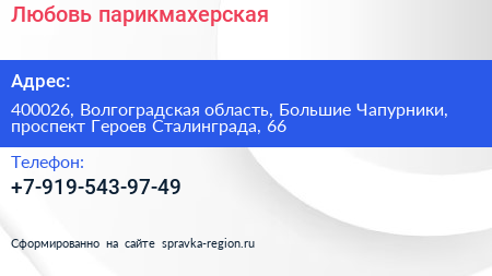 Любовь, парикмахерская по адресу 400026, Волгоградская область, Большие Чапурники, проспект Героев Сталинграда, 66 в дальнейшем Организация, размещена в следующих категориях: