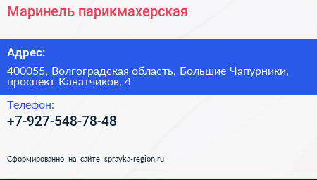 Маринель, парикмахерская по адресу 400055, Волгоградская область, Большие Чапурники, проспект Канатчиков, 4 в дальнейшем Организация, размещена в следующих категориях: