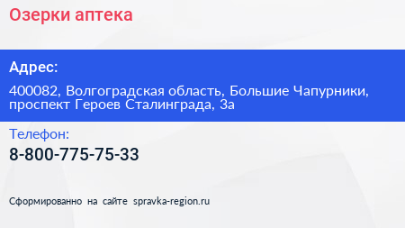 Озерки, аптека по адресу 400082, Волгоградская область, Большие Чапурники, проспект Героев Сталинграда, 3а в дальнейшем Организация, размещена в следующих категориях: