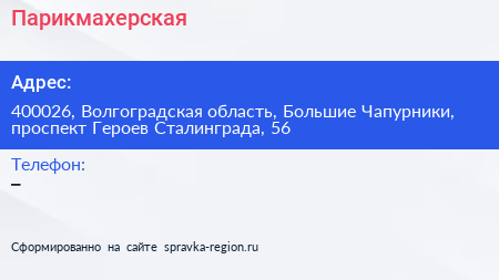 Парикмахерская по адресу 400026, Волгоградская область, Большие Чапурники, проспект Героев Сталинграда, 56 в дальнейшем Организация, размещена в следующих категориях: