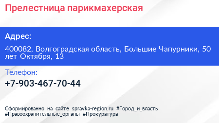 Прелестница, парикмахерская по адресу 400082, Волгоградская область, Большие Чапурники, 50 лет Октября, 13 в дальнейшем Организация, размещена в следующих категориях: