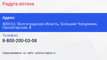 Радуга, аптека по адресу 400112, Волгоградская область, Большие Чапурники, Пролетарская, 8 в дальнейшем Организация, размещена в следующих категориях: