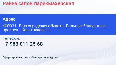 Райна, салон-парикмахерская по адресу 400031, Волгоградская область, Большие Чапурники, проспект Канатчиков, 11 в дальнейшем Организация, размещена в следующих категориях: