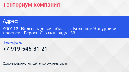 Тенториум, компания по адресу 400112, Волгоградская область, Большие Чапурники, проспект Героев Сталинграда, 39 в дальнейшем Организация, размещена в следующих категориях: