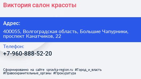 Виктория, салон красоты по адресу 400055, Волгоградская область, Большие Чапурники, проспект Канатчиков, 22 в дальнейшем Организация, размещена в следующих категориях: