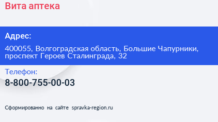 Вита, аптека по адресу 400055, Волгоградская область, Большие Чапурники, проспект Героев Сталинграда, 32 в дальнейшем Организация, размещена в следующих категориях: