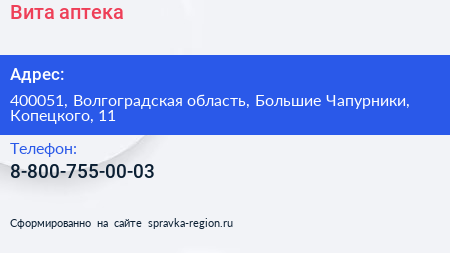 Вита, аптека по адресу 400051, Волгоградская область, Большие Чапурники, Копецкого, 11 в дальнейшем Организация, размещена в следующих категориях: