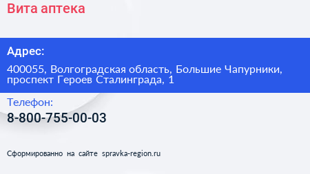 Вита, аптека по адресу 400055, Волгоградская область, Большие Чапурники, проспект Героев Сталинграда, 1 в дальнейшем Организация, размещена в следующих категориях: