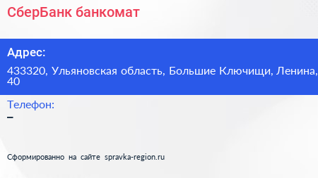 СберБанк, банкомат по адресу 433320, Ульяновская область, Большие Ключищи, Ленина, 40 в дальнейшем Организация, размещена в следующих категориях: