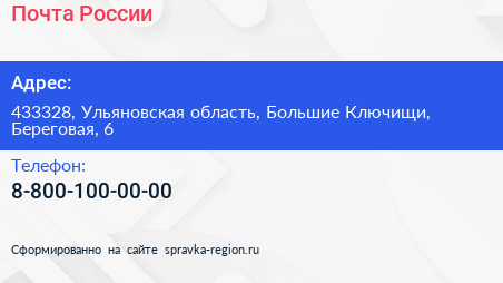 Почта России по адресу 433328, Ульяновская область, Большие Ключищи, Береговая, 6 в дальнейшем Организация, размещена в следующих категориях: