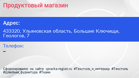 Продуктовый магазин по адресу 433320, Ульяновская область, Большие Ключищи, Геологов, 7 в дальнейшем Организация, размещена в следующих категориях: