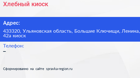 Хлебный киоск по адресу 433320, Ульяновская область, Большие Ключищи, Ленина, 42а киоск в дальнейшем Организация, размещена в следующих категориях: