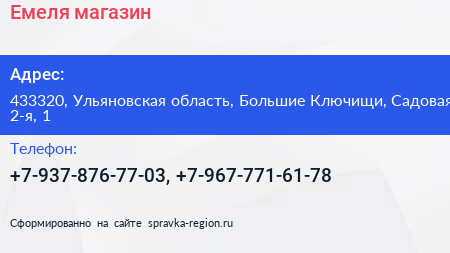 Емеля, магазин по адресу 433320, Ульяновская область, Большие Ключищи, Садовая 2-я, 1 в дальнейшем Организация, размещена в следующих категориях: