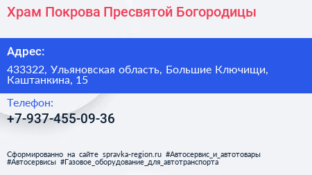 Храм Покрова Пресвятой Богородицы по адресу 433322, Ульяновская область, Большие Ключищи, Каштанкина, 15 в дальнейшем Организация, размещена в следующих категориях: