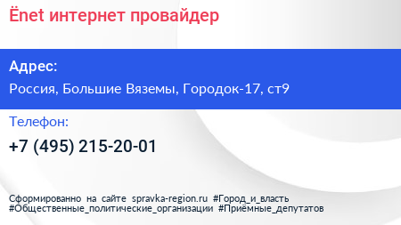 Ёnet, интернет-провайдер по адресу 26А/2, улица Городок-17, Городок-17, Школьный, Большие Вязёмы, Одинцовский городской округ, Московская область, Центральный федеральный округ, 143051, Россия в дальнейшем Организация, размещена в следующих категориях: