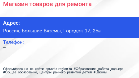 Магазин товаров для ремонта по адресу Дикси, 26А, улица Городок-17, Городок-17, Школьный, Большие Вязёмы, Одинцовский городской округ, Московская область, Центральный федеральный округ, 143051, Россия в дальнейшем Организация, размещена в следующих категориях: