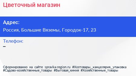 Цветочный магазин по адресу Дикси, 23, улица Городок-17, Городок-17, Школьный, Большие Вязёмы, Одинцовский городской округ, Московская область, Центральный федеральный округ, 143051, Россия в дальнейшем Организация, размещена в следующих категориях: