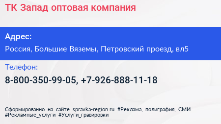 ТК Запад, оптовая компания по адресу Ozon, вл5 с2, Петровский проезд, Городок-17, Школьный, Большие Вязёмы, Одинцовский городской округ, Московская область, Центральный федеральный округ, 143051, Россия в дальнейшем Организация, размещена в следующих категориях: