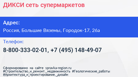 ДИКСИ, сеть супермаркетов по адресу Дикси, 26А, улица Городок-17, Городок-17, Школьный, Большие Вязёмы, Одинцовский городской округ, Московская область, Центральный федеральный округ, 143051, Россия в дальнейшем Организация, размещена в следующих категориях: