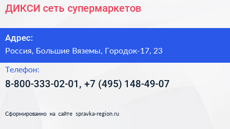 ДИКСИ, сеть супермаркетов по адресу Дикси, 23, улица Городок-17, Городок-17, Школьный, Большие Вязёмы, Одинцовский городской округ, Московская область, Центральный федеральный округ, 143051, Россия в дальнейшем Организация, размещена в следующих категориях: