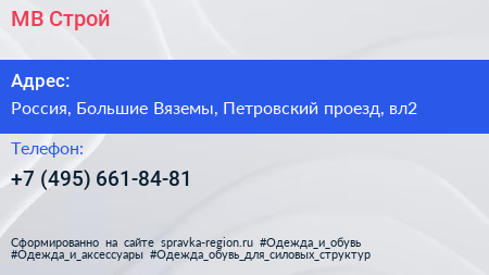 МВ-Строй по адресу вл2 с2, Петровский проезд, Городок-17, Школьный, Малые Вязёмы, Одинцовский городской округ, Московская область, Центральный федеральный округ, 143051, Россия в дальнейшем Организация, размещена в следующих категориях: