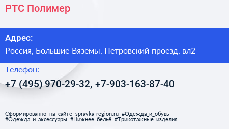 РТС-Полимер по адресу вл2 с2, Петровский проезд, Городок-17, Школьный, Малые Вязёмы, Одинцовский городской округ, Московская область, Центральный федеральный округ, 143051, Россия в дальнейшем Организация, размещена в следующих категориях: