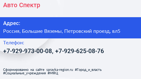 Авто-Спектр по адресу Ozon, вл5 с2, Петровский проезд, Городок-17, Школьный, Большие Вязёмы, Одинцовский городской округ, Московская область, Центральный федеральный округ, 143051, Россия в дальнейшем Организация, размещена в следующих категориях: