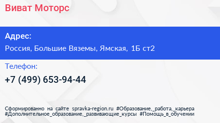 Виват Моторс по адресу РЭО ОГИБДД УМВД России по Одинцовскому г/о, Центральная кольцевая автомобильная дорога, Школьный, Большие Вязёмы, Одинцовский городской округ, Московская область, Центральный федеральный округ, 143050, Россия в дальнейшем Организация, размещена в следующих категориях: