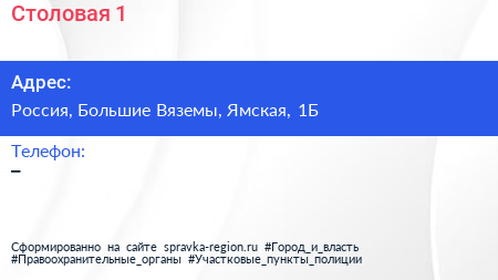 Столовая №1 по адресу РЭО ОГИБДД УМВД России по Одинцовскому г/о, Ямская улица, Школьный, Большие Вязёмы, Одинцовский городской округ, Московская область, Центральный федеральный округ, 143050, Россия в дальнейшем Организация, размещена в следующих категориях: