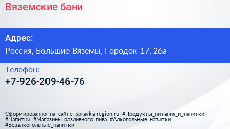 Вяземские бани по адресу Торговый центр "Радужный", 26А, улица Городок-17, Городок-17, Школьный, Большие Вязёмы, Одинцовский городской округ, Московская область, Центральный федеральный округ, 143051, Россия в дальнейшем Организация, размещена в следующих категориях: