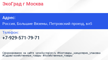 ЭкоГрад, г. Москва по адресу Ozon, вл5 с2, Петровский проезд, Городок-17, Школьный, Большие Вязёмы, Одинцовский городской округ, Московская область, Центральный федеральный округ, 143051, Россия в дальнейшем Организация, размещена в следующих категориях: