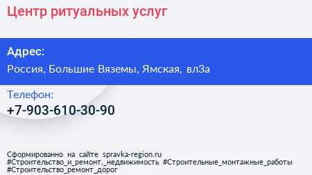 Центр ритуальных услуг по адресу Большевязёмское кладбище, Ямская улица, Школьный, Большие Вязёмы, Одинцовский городской округ, Московская область, Центральный федеральный округ, 143050, Россия в дальнейшем Организация, размещена в следующих категориях: