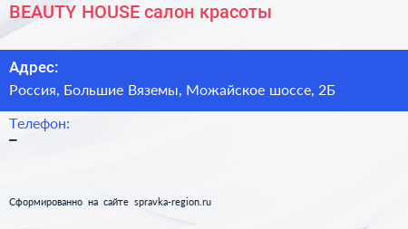 BEAUTY HOUSE, салон красоты по адресу Центральная кольцевая автомобильная дорога, Школьный, Большие Вязёмы, Одинцовский городской округ, Московская область, Центральный федеральный округ, 143050, Россия в дальнейшем Организация, размещена в следующих категориях: