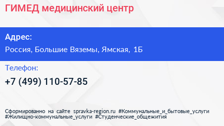 ГИМЕД, медицинский центр по адресу РЭО ОГИБДД УМВД России по Одинцовскому г/о, Центральная кольцевая автомобильная дорога, Школьный, Большие Вязёмы, Одинцовский городской округ, Московская область, Центральный федеральный округ, 143050, Россия в дальнейшем Организация, размещена в следующих категориях: