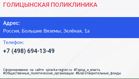 ГОЛИЦЫНСКАЯ ПОЛИКЛИНИКА по адресу Администрация сельского поселения "Захаровское", 1А, Зелёная улица, Летний Отдых, Одинцовский городской округ, Московская область, Центральный федеральный округ, 143022, Россия в дальнейшем Организация, размещена в следующих категориях: