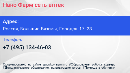 Нано-Фарм, сеть аптек по адресу Дикси, 23, улица Городок-17, Городок-17, Школьный, Большие Вязёмы, Одинцовский городской округ, Московская область, Центральный федеральный округ, 143051, Россия в дальнейшем Организация, размещена в следующих категориях: