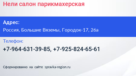 Нели, салон-парикмахерская по адресу Дикси, 26А, улица Городок-17, Городок-17, Школьный, Большие Вязёмы, Одинцовский городской округ, Московская область, Центральный федеральный округ, 143051, Россия в дальнейшем Организация, размещена в следующих категориях: